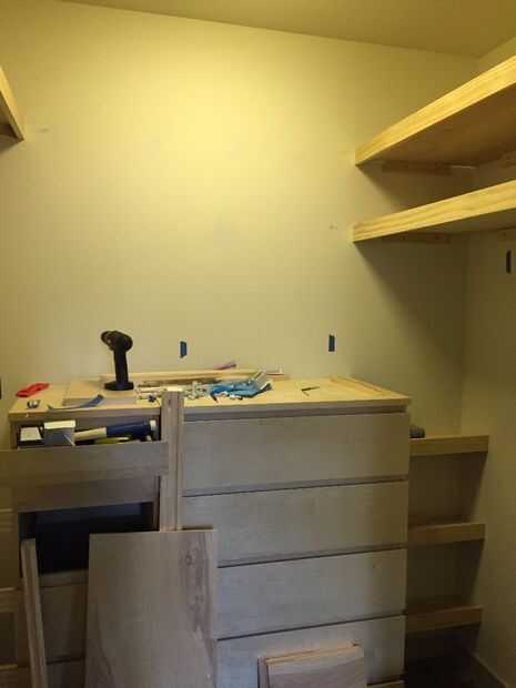 Una palabra acerca de los estantes - una de las ventajas del uso de aparadores preconstruidos es que simplifica muchísimo la medida de los estantes. Una "característica" de nuestro condominio es que, por cualquier motivo (mala ejecución, resolver), paredes relativamente pocos son realmente planas. Esto significa que el espacio para estanterías - en lugares idénticos - puede variar de 1/4 a 1/2 una pulgada. Para tener en cuenta esto, medí la distancia entre el aparador y la pared (o pared a pared, para los estantes de través) para cada estante, numeración de cada pieza cortada para la Asamblea.