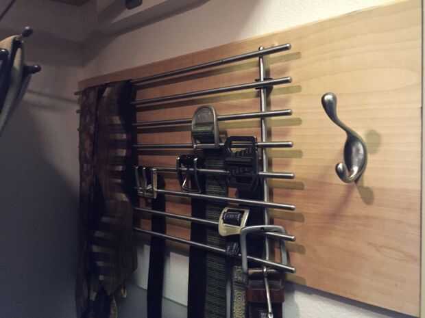 También se necesita un lugar para cinturones y corbatas, que hice por reasignación de una base grande (también de nuestros amigos suecos), unida a otra sección de la madera contrachapada, corte con los bordes biselados para caber el espacio a lo largo de un lado de la puerta. Funciona bastante bien.