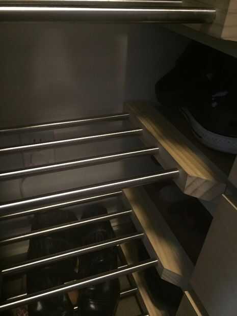 Soy demasiado perezoso para obtener imágenes, pero diseñé las rejillas que se pueden quitar para facilitar el acceso a los estantes en el lado izquierdo de la Asamblea de aparador. Taladrar los agujeros para las clavijas de madera en cada una de la plataforma las vistas (y pedazos que emparejan en el lado de la pared) y entonces perforado agujeros medio equivalente (sujeción juntos los pedazos de la dos tapa de cada estante del zapato para que se ajuste) para caber sobre los taquetes. Si es difícil de visualizar, no es terriblemente importante - todavía funciona bien.