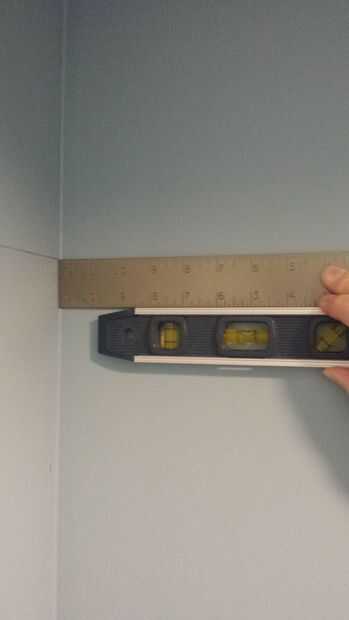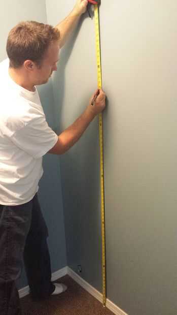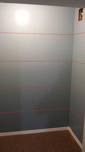 Iniciar en la pared de centro (atrás) y mida su distancia. Mis estanterías son 15" aparte así que marqué cada 15" desde el piso. Sólo hacerlo una vez y sólo una de las paredes. La razón es la mayoría del suelo no es muy de nivel y si se mide desde el piso cada vez encontrarás tus marcas no siempre alineados.