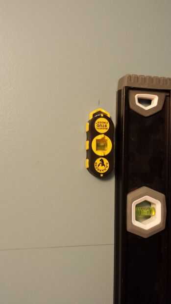 1. tengo un poco magnética "stud finder" que compré en Amazon por $7 y funciona igual de bien o mejor que cualquier buscador del perno prisionero nunca he usado. Realmente encuentra los tornillos que se clavan en el espárrago (que puede o no puede estar bien centrado). Una vez que encontré el perno en la parte superior de la pared, hice similar para el mismo ubicado en la parte inferior de la pared y utiliza el nivel como un borde recto para hacer tic marcas por encima de cada línea que dibujó.