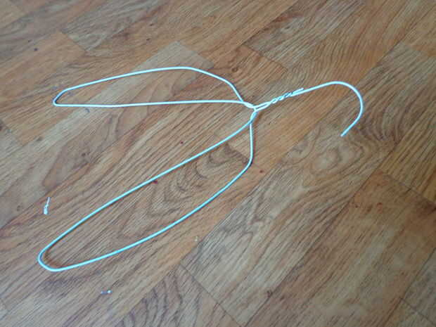 Tire hacia arriba la parte inferior de la percha en el pliegue de centro y meta detrás del gancho de la suspensión como se muestra.