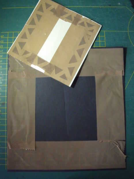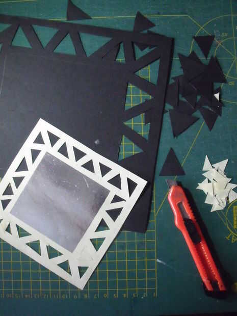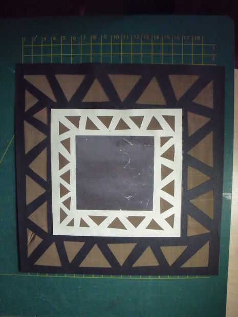 Hacer el papel (josh y negro) cuadrado. Cortar triángulos en un borde redondo el oro en el papel de josh. Marcar la casilla de josh en el papel negro y hacer un borde similar de agujeros triangulares.