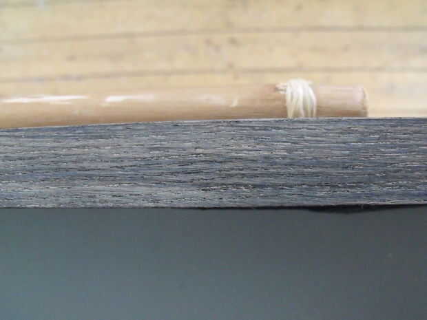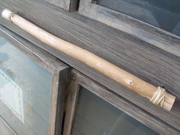 Quitar las manijas existentes. Busque dos bonitos trozos de rama de árbol. Quitar la corteza. Haga dos orificios en cada manija y poner un alambre de hierro a través de. Cubrir el alambre con algunos rafia. Pase el cable a través del cajón y doblado hacia el exterior en el interior. Tapa de extremos puntiagudos con algunos (conducto) cinta
