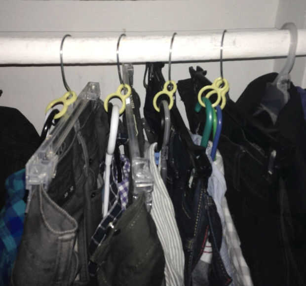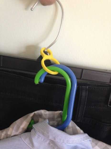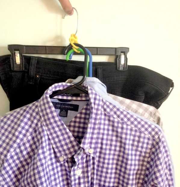 Una vez haya tomado esta decisión difícil, uso un par de gancho de la suspensión 8 para mantener la suspensión de la parte superior de la camisa con la percha de pantalón como se muestra en la foto de arriba.