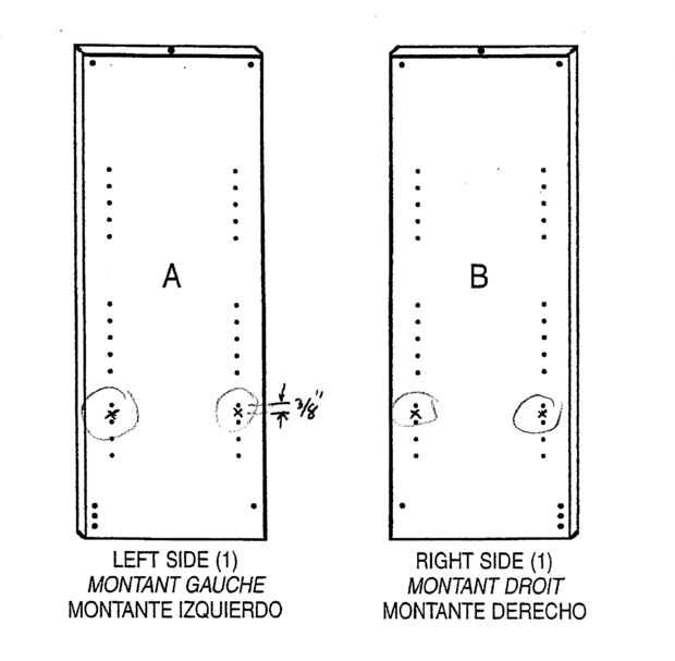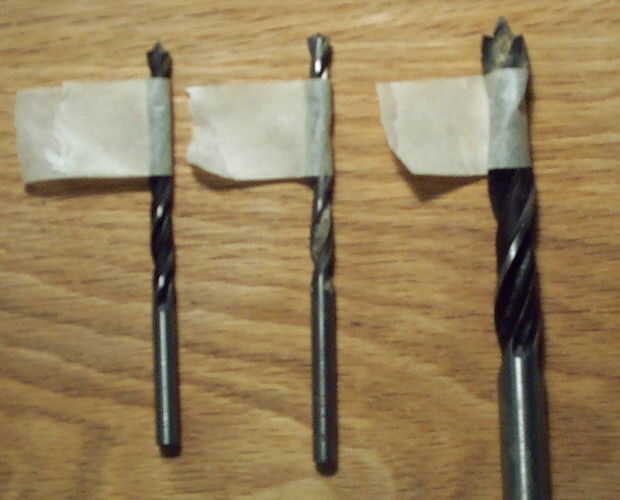 Los orificios previamente perforados de los estantes no estaban en una buena ubicación para llegar a una altura óptima para la muñeca. El espacio es una prima y no quiero perder demasiado solo para usar los agujeros me dado. Mis hijas tienen un stand para su muñeca y una altura interior de 3/4 19" parecía mejor (esto da un poco extra altura de las muñecas en un soporte y tenga también un sombrero de). Terminé un conjunto de agujeros de 3/8" abajo del agujero existente que era 20 1/2" de la parte superior de la perforación. Las brocas punto de brad son realmente agradables para perforar y no saltar a la superficie de la melamina duro. Lamentablemente, la punta central largo no permite suficiente profundidad para los soportes del estante a todos de la manera en el asiento. Así todos los agujeros perforé una segunda vez con una broca normal. Por estos agujeros, usé un taladro con una parada para que no accidentalmente pasó todo a través de las paredes laterales estos agujeros. Una bandera de cinta de enmascarar en los pedacitos de taladro funciona igual de bien si usando un taladro de mano.
