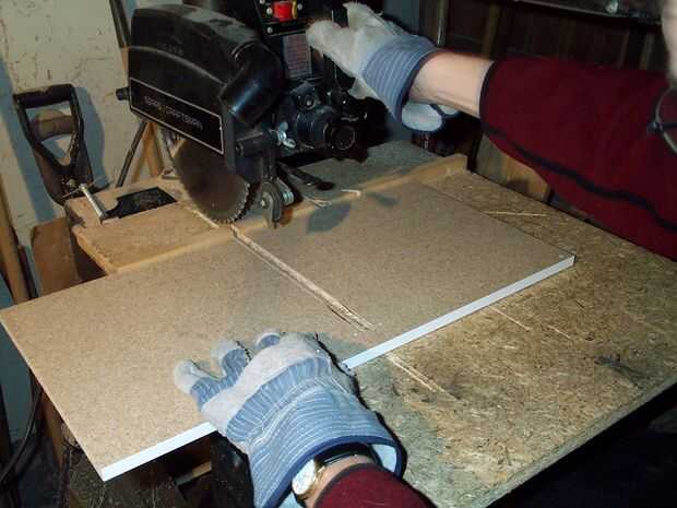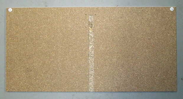 El divisor vertical debe ir de la plataforma a la nueva altura en el último paso en la parte superior. Para evitar cualquier hardware visible para asegurar el divisor vertical, se corta una ranura en la parte inferior del panel superior del gabinete. Esta ranura debe ser de 5/8" de ancho y 3/16" de profundidad para sujetar la pieza extra de estantería. Corte la ranura con varias pasadas con una sierra de brazo radial a partir de la parte posterior del panel superior. Desde el panel superior es 1/2" de grosor, la hoja se estableció 5/16" de la superficie de trabajo. La sierra radial del brazo es fácil conseguir un corte muy recto. Tiré la hoja hasta el frente del corte fue incluso con los agujeros de los tornillos de cierre magnético. Una vez que el canal era completo, utilicé un router para aplanar la parte delantera de la ranura. Un router podría ser utilizado para cortar el canal entero, pero que requiere un poco de trabajo más preparación para obtener la ranura recta.