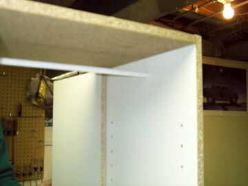 La barra del armario (3/8" pasador) debe colocarse tales que hay suficiente espacio para los soportes de suspensión. Desde la parte trasera del gabinete, deslice el estante/divisor combo (que ahora es una unidad) en el gabinete Marque la ubicación de los orificios para el pasador para insertarse. Mis medidas tumbado este 1 1/4" de la parte inferior del panel superior y centrado hacia la parte delantera en el divisor vertical. En este momento también medir la longitud de la barra de pasador. La barra debe ser la distancia entre el divisor y panel lateral + 3/8". Tire el divisor deshacemos (última vez prometo) taladre un agujero en el lateral y central divisor. Otra vez usar una bandera de cinta de enmascarar en la broca para evitar ir toda la manera a través. El agujero sí mismo sólo debe ser 3/16" profundidad para sujetar la varilla de pasador. Cortar la varilla de pasador con una sierra de marquetería. Si gira la clavija mientras lo corta, se puede evitar astillar la barra en ese último tirón del corte.