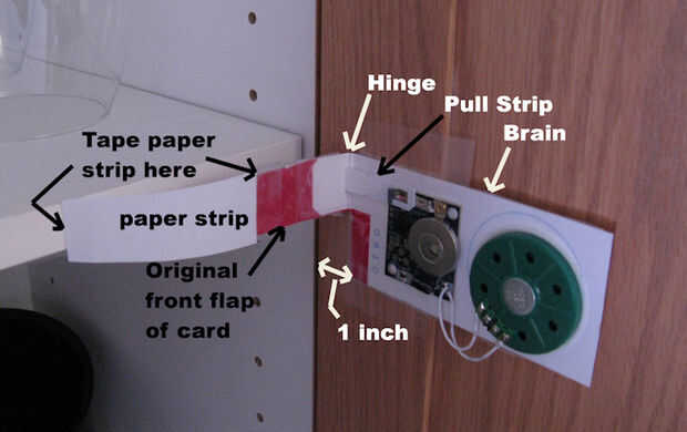 Simplemente cortar el cerebro de la tarjeta, junto con la sección de la aleta delantera que contiene la tira de extracción. Con cinta adhesiva el cerebro a la puerta del armario para bisagra de la tarjeta es cerca de 1 pulgada (25mm) desde el interior borde de la puerta. Luego, corte una tira de papel y un extremo en la parte interior de cinta útil y el otro extremo a la tapa frontal original de la tarjeta. Este es el paso más importante, desde el armario más puertas no depender de un solo pivote, la tira de papel sirve para tirar de la tapa frontal en lugar de desplegarlo.