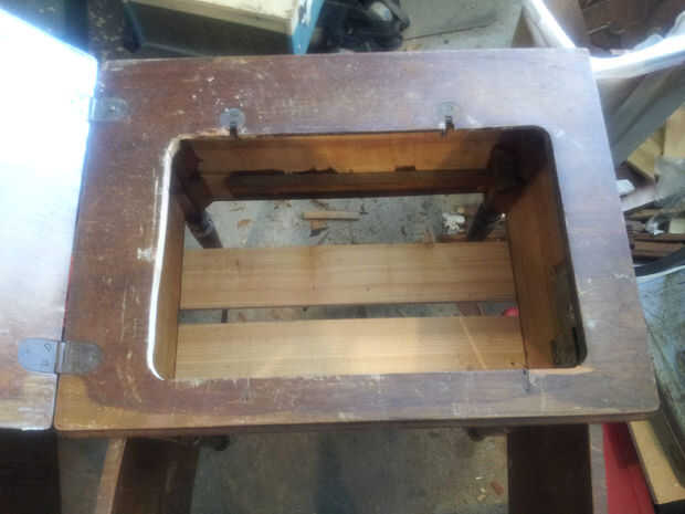 Usando un jig Sierra, agrandamiento de la abertura en la parte superior del gabinete (Foto 2) por lo que encajaría en la nevera.