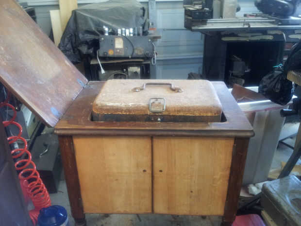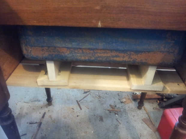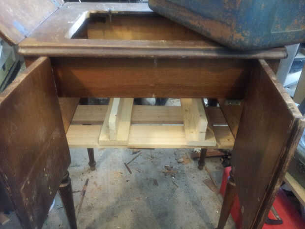 A continuación, medir la altura de la nevera y hace un par de canalizaciones verticales de madera (Foto 3) para levantar el refrigerador lo suficientemente alto como para que la tapa abra (fotos 4 y 5). Cuando no se utiliza el refrigerador, las canalizaciones verticales se quitan y se guardan en el refrigerador para permitir que la tapa del gabinete para bajar. Foto 6 muestra la nevera en su posición bajada.