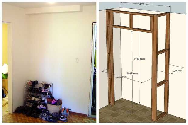 Este diseño se significa para un armario de esquina de altura completay todo suficiente para adaptarse a un conjunto amplio de 4' de puertas corredizas (dos 2' amplias puertas correderas de espejo). Siempre había odiado el boxeo desordenado que resaltó en esta habitación, y siempre estábamos tropezar con zapatos que se vertieron bruscamente en el piso. Un armario de 4' de ancho abarcaría ambos problemas. Todo lo que se necesitaba era dos cuadros simple, que podrían fijarse a las paredes, piso, techo y entre sí. Para dimensiones, ver el dibujo.