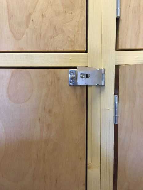 Con las bisagras, asegure las puertas dos veces con un par de bisagras y colocar un cerrojo para cada puerta.
