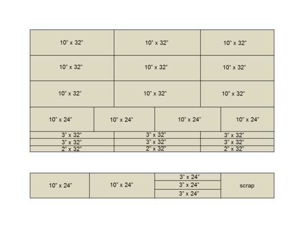 Después de algún pensamiento, colocó en gabinete casos que son aproximadamente de 32 pulgadas de ancho, 24 pulgadas de alto y 10 pulgadas de profundo, con un estante intermedio. Los tres gabinetes requieren una completa hoja de madera contrachapada, además de un poco más que yo fue capaz de sacar de mi montón de chatarra.