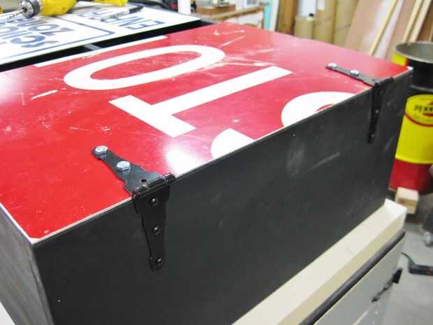 Las puertas metálicas fueron atadas a los casos gabinete con bisagras decorativa correa. Este tipo de bisagra era el único tipo que encontré que me permitiría apernar las puertas metálicas delgadas a ellos cuando sea necesario, pero me encanta el aspecto acabado.