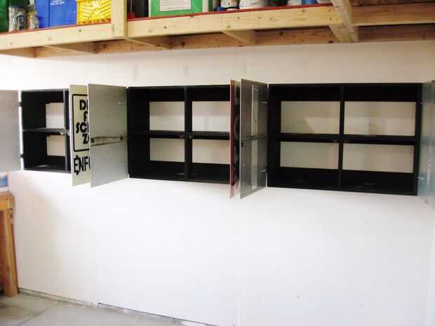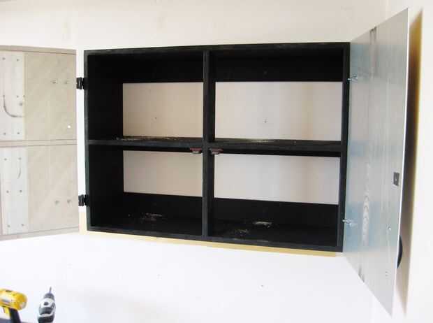 Cada gabinete fue apoyado en su lugar y fijada con tornillos a través de los agujeros pretaladrados en los montantes de la pared. Luego fue quitado el tablero inferior.