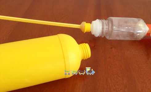 Pegue la paja al tapón de la botella de lavavajillas después palillo en el agujero de la botella de plástico. Recuerde que todo debe ser hermético.