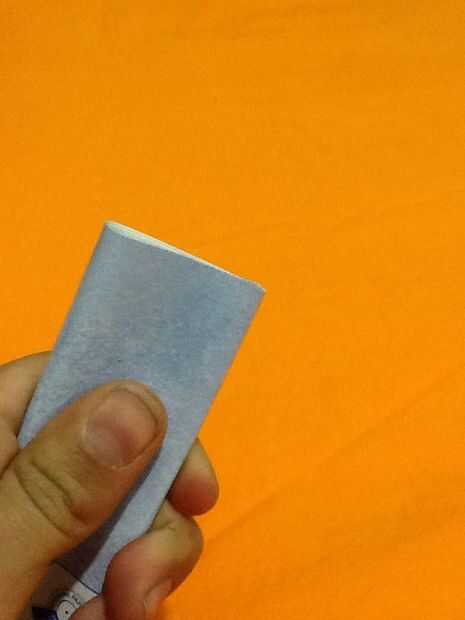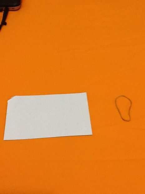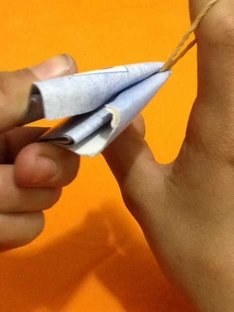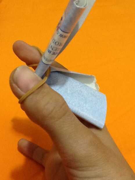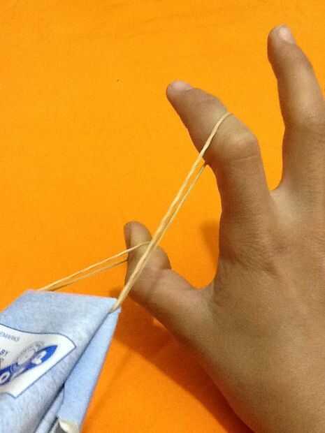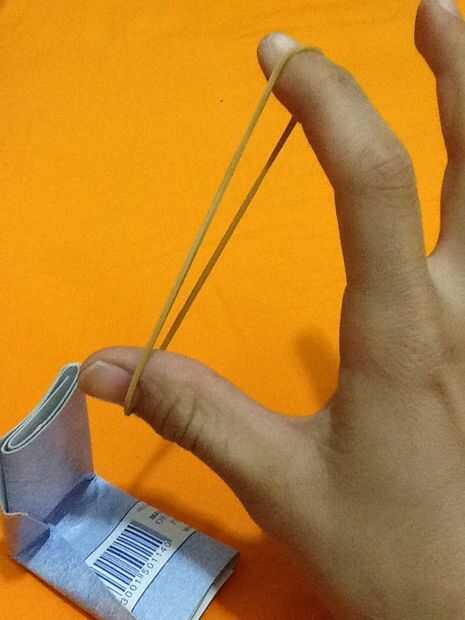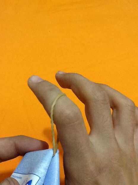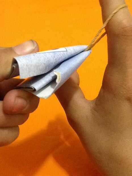 This is the first step. Materiales tipo 1: 2 manos, una banda de goma y un pedazo de papel toma el pedazo de papel y rodarla estilo hamburguesa, hasta que quede una gallina rodillo aplanar con los dedos y luego doblar por la mitad y listo. Poner la goma en los dedos como se muestra y luego ponga el papel en como se muestra y tire hacia atrás, objetivo y fuego