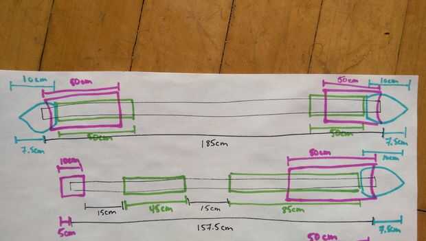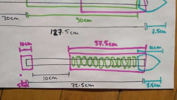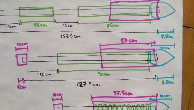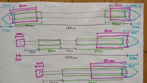 Pompfen normal todos utilizan el mismo proceso de construcción se describe en el paso 2. En este paso, nos hemos provisto de diagramas esquemáticos para cada Pompfe, tubería y relleno longitudes marcadas claramente. El negro es la pipa del PVC, el azul son las mini pelotas de fútbol, verde es el aislamiento de la pipa de espuma y rosa es aislamiento de la pipa de goma.