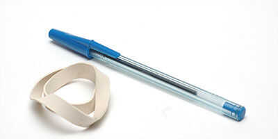 Sostenga la banda de caucho entre el pulgar y el dedo medio de mano izquierda (si es diestro). Mantener el caucho de la banda tan firmemente como sea posible (los dos dedos lo más lejos de uno a como sea posible). Esto es para facilitar el siguiente paso. La tapa de la pluma TEC tiene que sentarse en la pluma como lo coloque así viene la banda de goma entre la pluma sí mismo y el brazo de la tapa. Ver imagen para la correcta colocación de la leña.