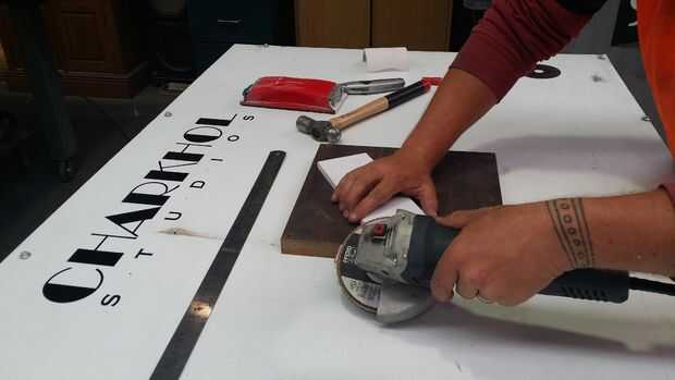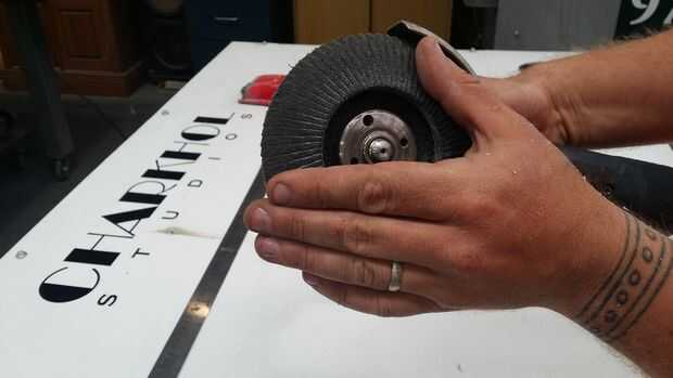 Utilizando el disco de la aleta en sus 4 pulgadas, comenzar a moler arena lejos del borde del hacha.