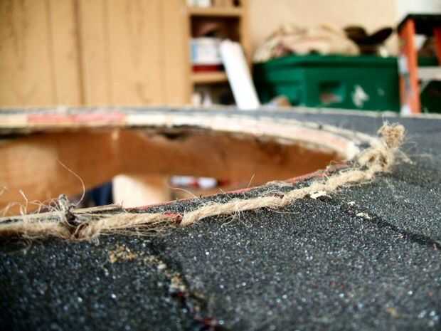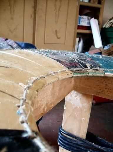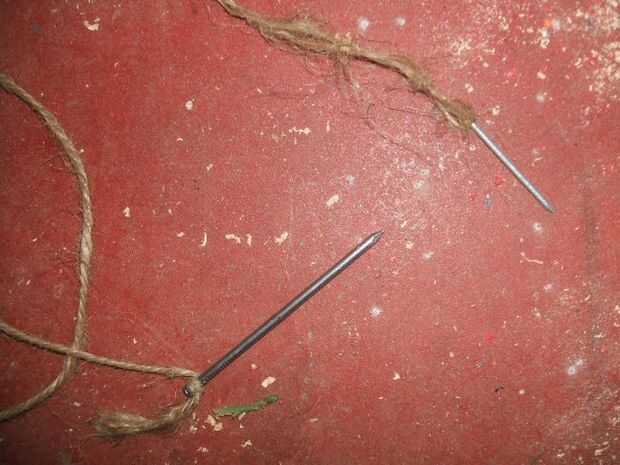Hay probablemente muchas maneras de hacer esto. Corté un pedazo largo de guita, sobre tres veces la circunferencia del anillo. En cada extremo até un clavo. Cadena a través del primer agujero. Unir los extremos y poner la mitad de la longitud de cada lado del agujero. Coser todo el perímetro con una longitud y todo el camino alrededor con la otra (misma dirección).