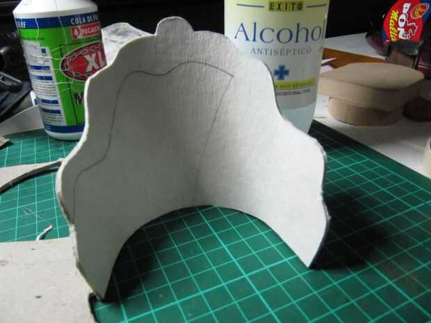 Dibujé el respaldo en 4 trozos de 20 × 15 cm cartón, dos de ellos fue pegado junto y cortado apagado. Para doblarla, rociaron con alcohol. Cuando la cartulina está mojada, es más fácil de doblar. Doble la cartulina mojada sobre una superficie curva, utilicé mi pierna (puede utilizar una botella), depende de la curvatura deseada, haciendo que la presión durante unos minutos hasta que la cartulina esté seca. Asegúrese de que el respaldo en la base del asiento.