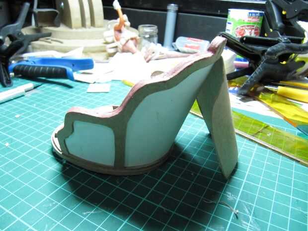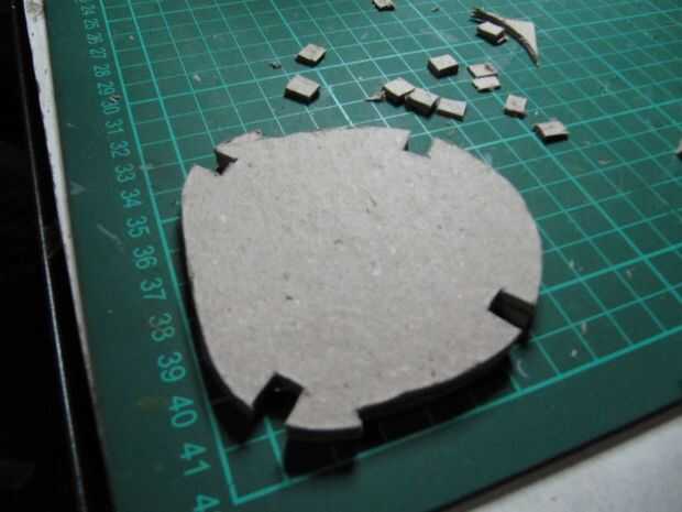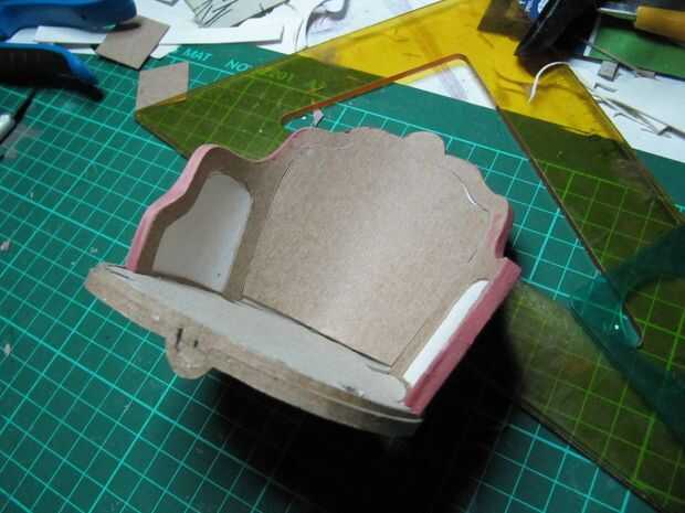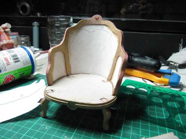 He pegado unas 4 capas de cartón y dibujó y ejecutado el asiento. Era necesario hacer la ranura para las piernas. Luego pegué el asiento y el respaldo. Lijar los bordes y, para un mejor acabado, extender la masilla roja y lija otra vez. Corté una tira de 30 x 0,3 cm de cartón con un semicírculo en el centro. Esta tira se pega alrededor del asiento.
