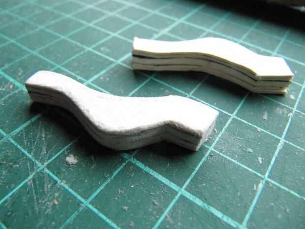 Las piernas se hicieron uniendo seis capas de cartón, un rectángulo de 3.5 x 2.5 cm es suficiente. Corte cuatro patas y luego insertarlas en la ranura del asiento. Fueron enarenadas y difundidos con masilla roja.