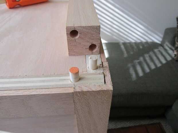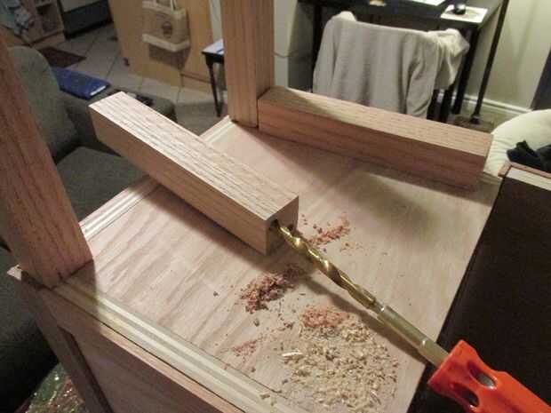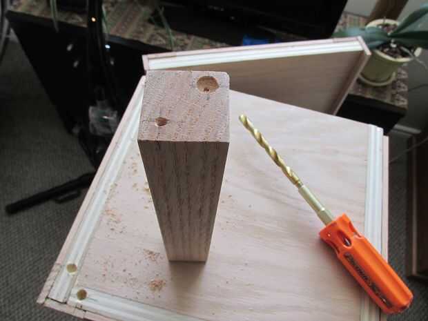 Aquí mi plan era hacer 2 agujeros en cada pierna y 2 agujeros correspondientes para cada pierna en la base del ropero, luego ponen un taco y algunos pegamento en los agujeros. Marcado cada pierna individualmente por lo que los orificios se alineen.