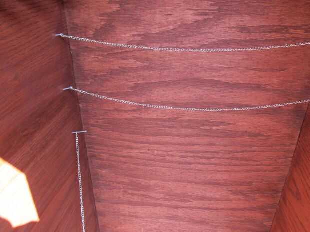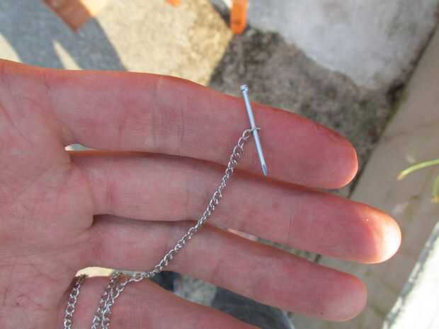 La cadena fue encordada para arriba con acabado uñas, albergará unos pendientes. Medirlas a todas longitudes de clavo primero, cadena por segundo, lo contrario es un dolor.