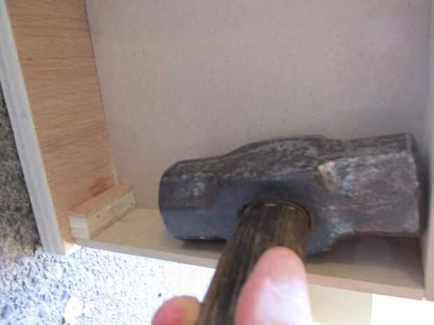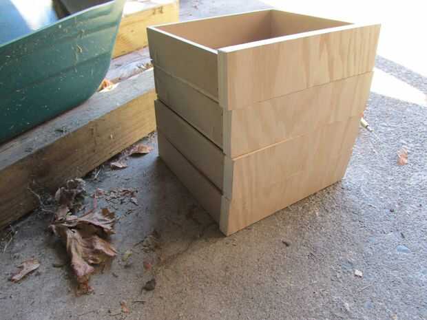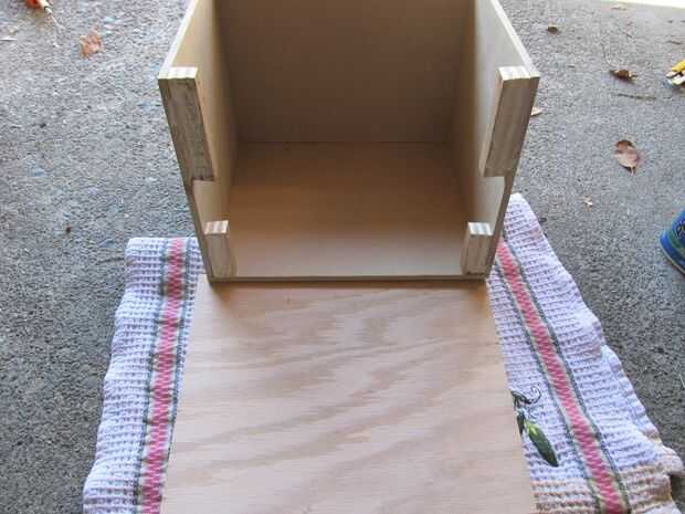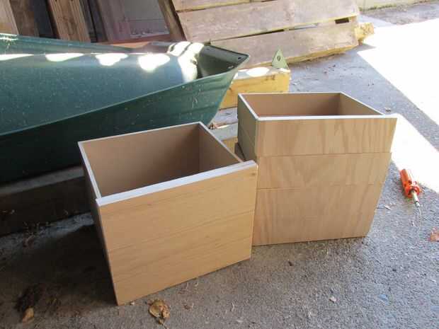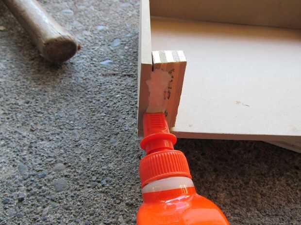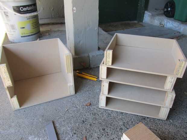 No pude averiguar cómo poner el frente en los cajones sin necesidad de un tornillo o clavo en la cara de los cajones. Después de que algunos pensaban cortar un puñado de pequeños rectángulos de madera actúan como intermediarios para el frente y la parte posterior de los cajones. Usé algunos clavos y pegamento para madera para subirse los frentes.