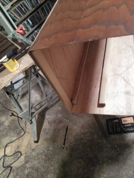Manchado los frentes de los cajones y algún ajuste que corte antes, también consiguió la tapa manchada y el soporte posterior para la estabilidad y para las bisagras para poder atornillar a la tapa. Sé que Menards es un gran lugar para manijas y bisagras a excelentes precios. Un gran método para la tinción es un trapo, tengo un montón de viejas remeras que rasgado para arriba para tinción, sólo se sumergen en y frotarla en, a diferencia de la pintura la mancha permanecerán en la madera y no frotar, su solo roce el exceso, para que sea un poco más fácil que he utilizado un pincel de espuma en las esquinas de los bordes redondeados.