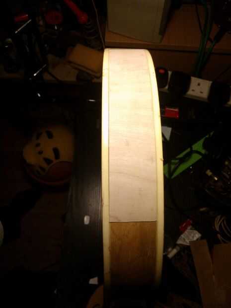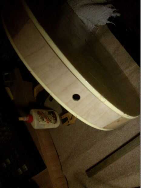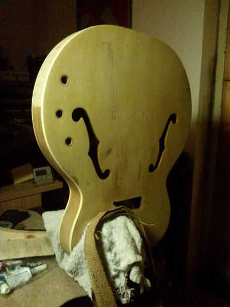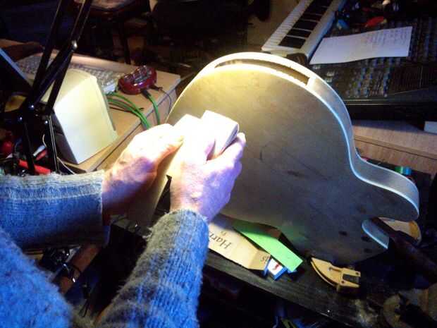 Primer trabajo fue reparar el borde inferior del cuerpo semi acústico. Gracias, KC, para la preparación de la zona dañada y formando el parche.