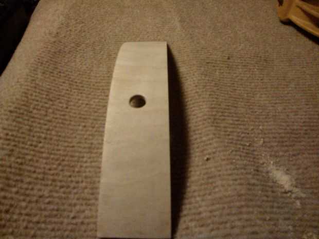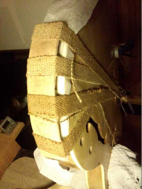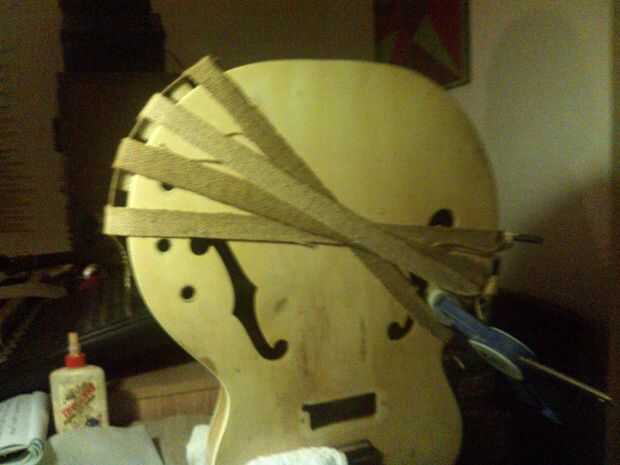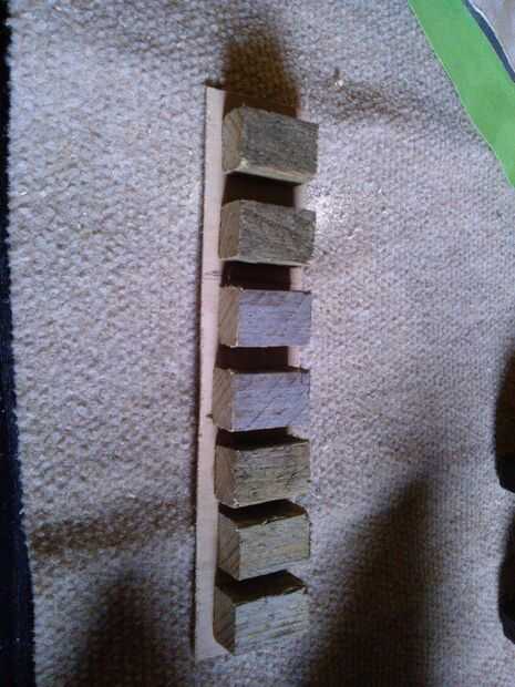 El remiendo de la reparación es trabajado en forma. El orificio para la toma de jack, taladrado. Dispone de la pieza, utilizando un pegamento (marca) adecuado.  El gizmo en la foto es un amarre-puente, que se coloca entre la pieza de reparación y las correas de sujeción, que distribuye la carga uniformemente sobre la longitud. Hice esto de pequeños bloques de madera pegado a una estrecha tira de la madera contrachapada que corté un par de mm más estrecho que el remiendo de la reparación para asegurar fue presionado completamente en el espacio.  Usé papel impermeable a la grasa entre la reparación y los bloques para evitar que los dos de ser uno.