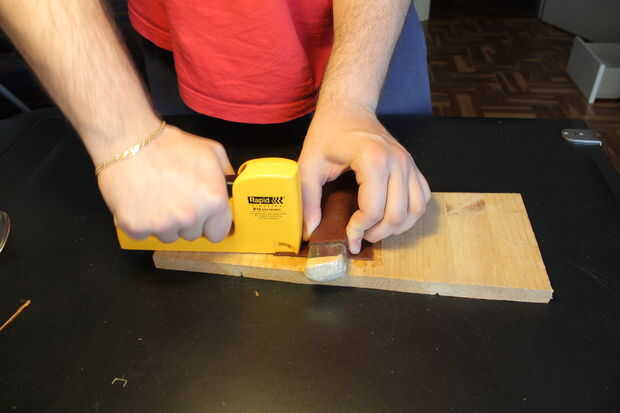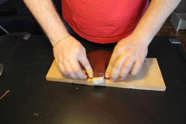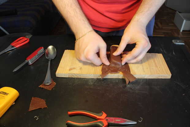 En primer lugar tienes que cortar un pedazo de cuero lo suficientemente grande como para cubrir el objeto. Asegúrese de dejar suficiente exceso en la parte inferior y a los lados: Esto le permitirá tener un montón de material para trabajar en y cuero en su trozo de madera de la grapa.