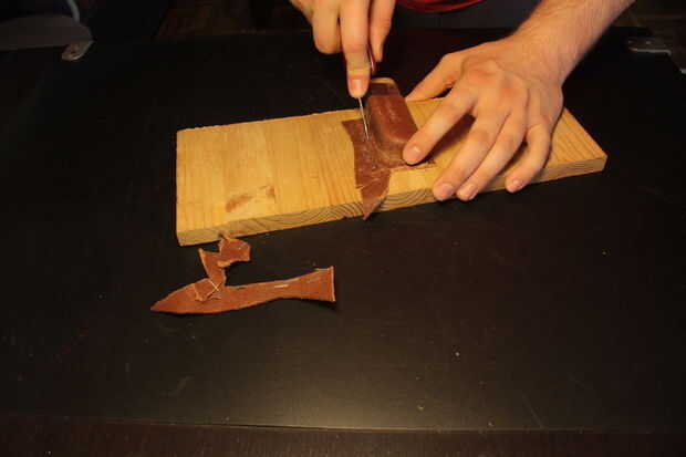 Observe que si usted quiere teñir el cuero es mejor hacerlo antes de configurar el botón snap. No es necesario pero añade un toque agradable al producto final, y también permite cubrir cualquier arañazos te podría haber hecho de su piel mientras lo moldeado. Ya que no tengo tintes de cuero específicos, he intentado usar tinte de zapatos, y he encontrado que funciona bastante bien. Sugiero utilizar guantes de látex y una bolsa de plástico para evitar la propagación de tinte en su área de trabajo y ustedes mismos.