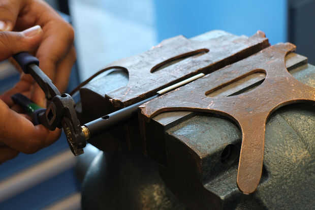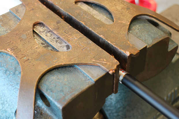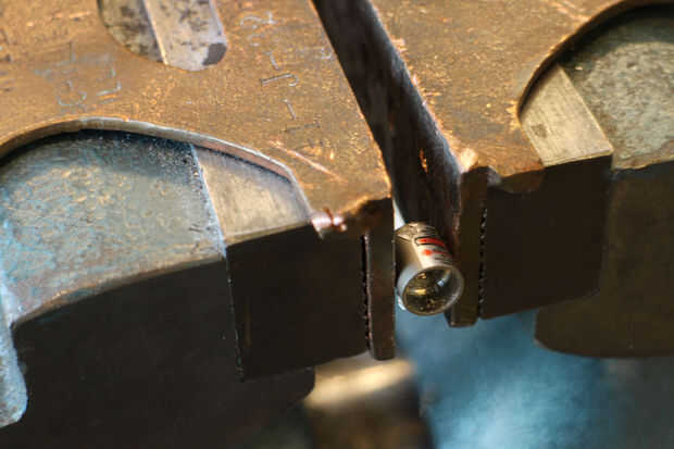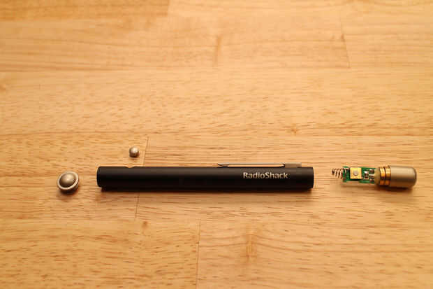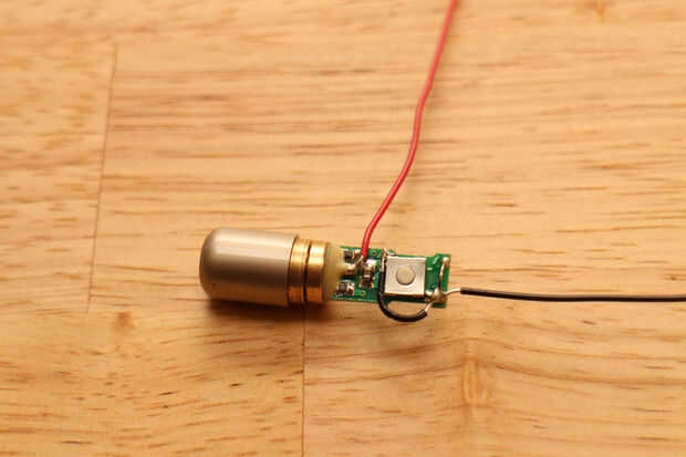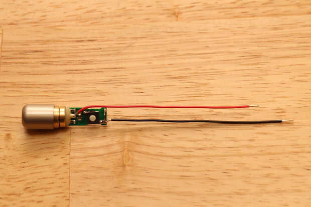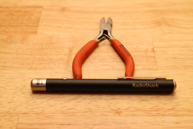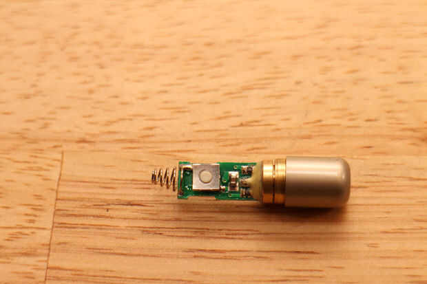 El puntero láser completo es demasiado voluminoso para montar nuestro servo wee, así que tendremos que quitar el diodo y el conductor del tubo del cuerpo. El módulo del diodo se mantiene firmemente en lugar por la fricción en la punta, por lo que tendremos que tirar de ella. Terminé usando un tornillo de banco y alicates para separar el puntero.