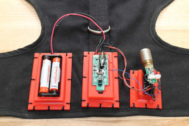 He creado tres montajes separados de la electrónica que todo fácilmente y firmemente cosido en el arnés. Diseñe las piezas de Autodesk fusión 360 e impreso de PLA en una impresora 3D Afinia. Descargar los archivos adjuntos .stl e imprimirlos. La batería debe encajen en su lugar, pero el PCB RC requerirá un poco de pegamento para permanecer seguro en su montaje.