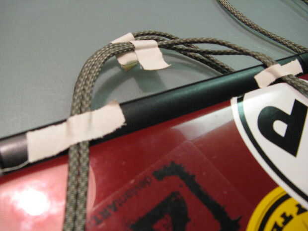 Las piezas con cinta en la parte superior de su ordenador portátil, una a cada lado del centro y con cinta adhesiva hacia abajo sobre como desea las manijas que. Errar en el lado de un poco más corto y asegúrese de que usted haga lo mismo al otro lado.