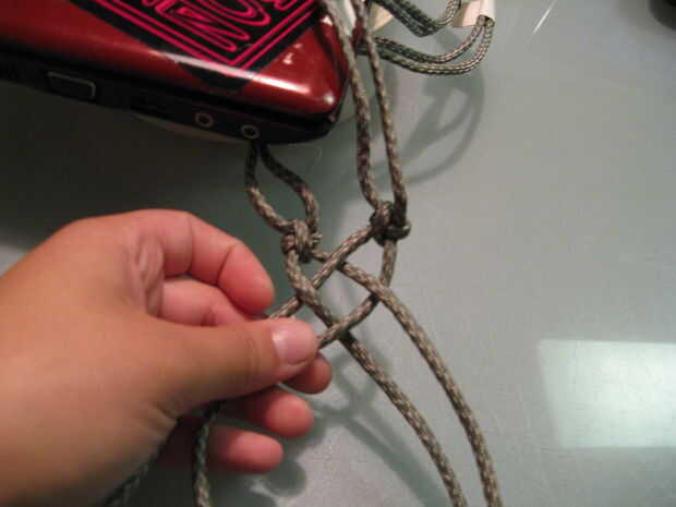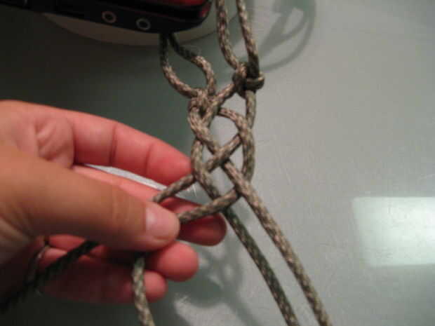 Una vez que termines con eso, poner un nudo cruzado en cada par de hilos. Hacer esto a ambos lados del arnés. La simetría es tu amigo, como es incluso separación.