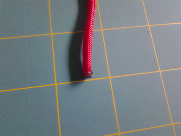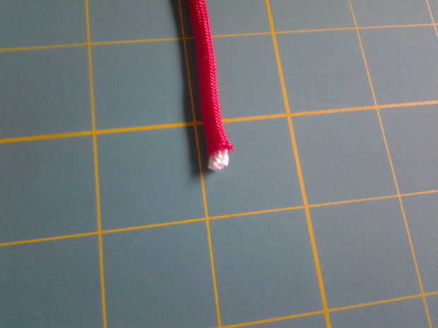 Recordar la medida de la barriga, ahora corte una longitud de cable de aproximadamente siete veces mientras el vientre. Quedará con un final difuso con cuerda blanca entrando por el medio. Encienda una vela y ponga el extremo en la llama por un momento. Mira al final si resulta aún difusa puesto que vuelva, pero ten cuidado que no quiere encenderse el cable! Cuando haya terminado debe parecerse la segunda foto. Este proceso se llama fusión y evitará que el cable se deshilache y deshaciendo.