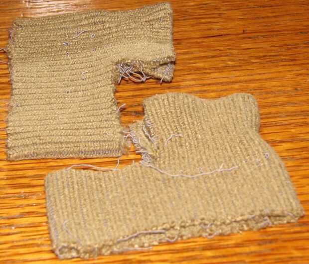 Primero agregar algún relleno alrededor de las bases de gancho de metal. Corte las puntas de calcetines viejos para esto, pero probablemente trabajaría cualquier restos de material suaves. Aquí el material es dentado por lo que el material no manojo hacia arriba como envuelve alrededor de la parte superior de la base del gancho.