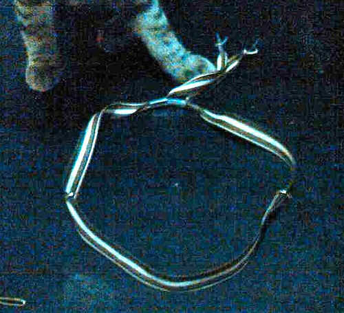 - Imperdible el final abierto del tubo de nuevo y utilice uno de los extremos del cable para perforar a través de la banda 1/4 / 6mm más o menos desde el extremo, encadenando el fleje en la imperdible en lugar de a través de él.