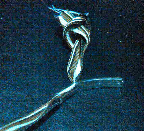Pescar el otro extremo de la cincha a través al otro lado de la parada de cable y hacer un nudo o colocar algo hasta el final para evitar que se tire. Ahora tienes un gran bucle con dos enlaces de correa ensartadas en él y los extremos Unidos por una cable de parada. Someter para aprobación del cliente.