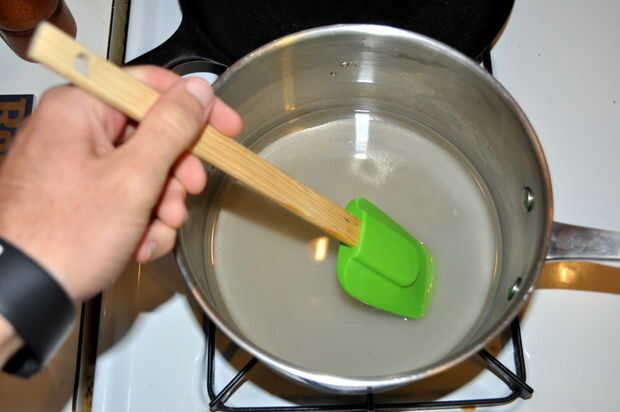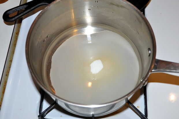 Vierta 1 taza de agua en la olla pequeña.  Empezar a llevar el agua a hervir.  Como el agua es revolver calefacción 3/4 taza de azúcar.  Una vez que el azúcar se haya disuelto completamente (si eres algo como yo el agua no esté hirviendo todavía y sabe lo que dicen "una olla vista nunca hierve") usted puede cáscara sus dos limones mientras espera la ebullición.