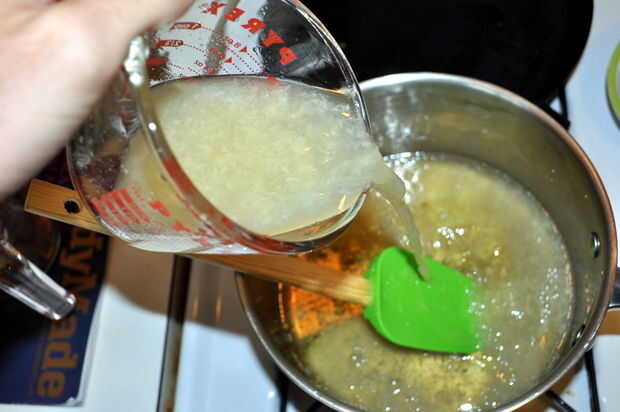 Ahora que hemos giran nuestros pulgares para fiveish minutos es hora de agregar la taza de jugo de limón.  Vierta el jugo y revuelva la mezcla.  En este punto que su mezcla debe probar algo como concentrado de limonada y será bastante caliente todavía. Si es demasiado amargo para ti ahora sería un buen momento para añadir y agregue más azúcar al gusto.