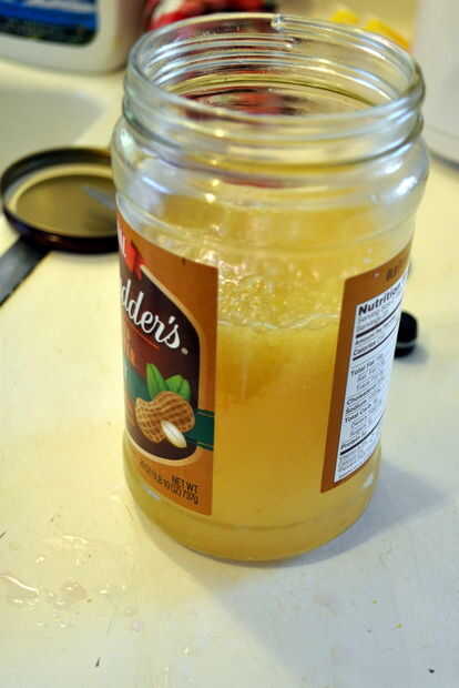 Si usted tiene solamente un pote como yo tendrá que verter la mezcla en otro recipiente se enfríe.  Opté por verter en un frasco de mantequilla de maní porque tengo un montón de los que rodean.