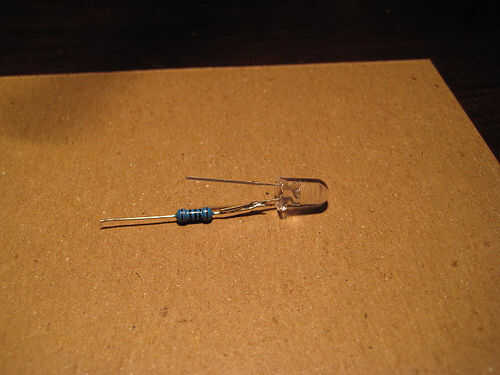 La resistencia de la soldadura es muy fácil. Usted puede poner la resistencia en lo negativo o lo positivo. No importa. Usé el positivo. Generalmente en un LED, el positivo es el más largo de los 2 conductores. Corté mi positivo conduce antes de soldar, para hacer la longitud de cada uno casi lo mismo después de que la resistencia de la soldadura.