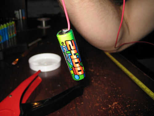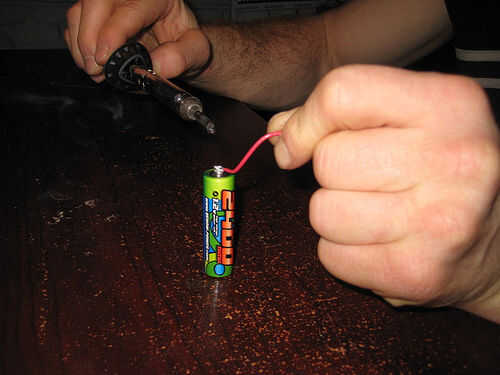 Poner algún flujo en el extremo de la batería y el extremo del alambre. Actúa como agente de vinculación para la soldadura y hace mucho más fácil soldar. Poner un pegote grande de soldadura en la soldadura de hierro. Toque el cable a la batería y empuje el soldador en la parte superior. No necesita ser ayuda en más de 5 segundos. Quite la plancha y soplo en la soldadura. Debe endurecer y podrás recoger la batería con solo el cable. Si se cae vuelva a intentarlo.